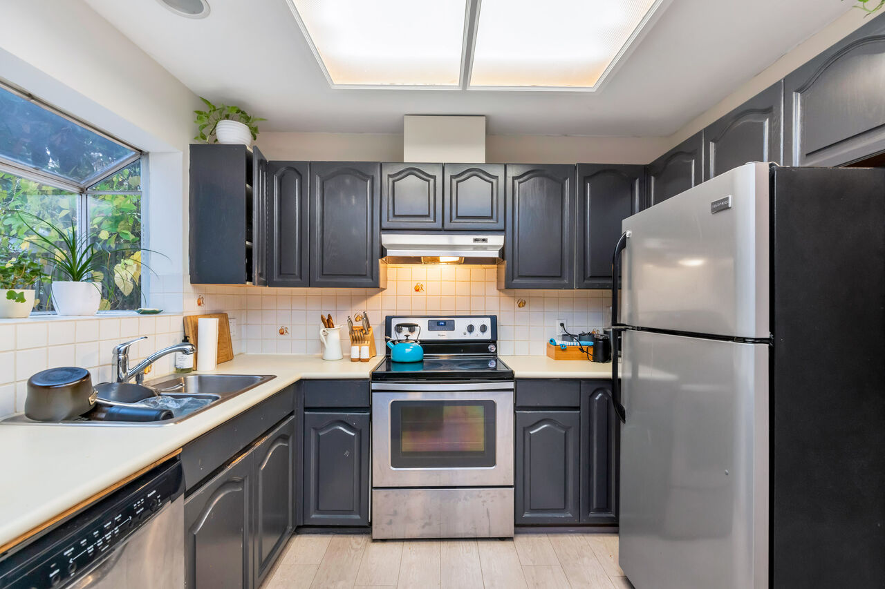 Welcome to the best opportunity in the area with rare dedicated lane access and easy living location. The layout of the home gives you wonderful big bedrooms upstairs and a bright open family room kitchen with separate living and dining room areas on the main floor. There is an additional den on the main floor for working from home. The large garage and ample parking complete the upper two levels of the home. Downstairs has an additional two bedroom accommodation for a nanny or family with its own fenced and private yard. Come and see this home, and the opportunity it presents. Newer roof and appliances including hot water heat, newer floors and carpets, fenced double yard. With transit, parks and shopping steps away this home lacks nothing and delivers it all. Come and see for yourself.
